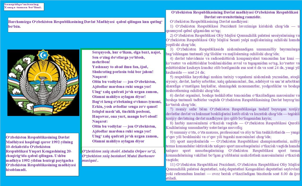 Barchamizga O'zbekiston Respublikasining Davlat Madhiyasi qabul qilingan kun qutlug' bo'lsin